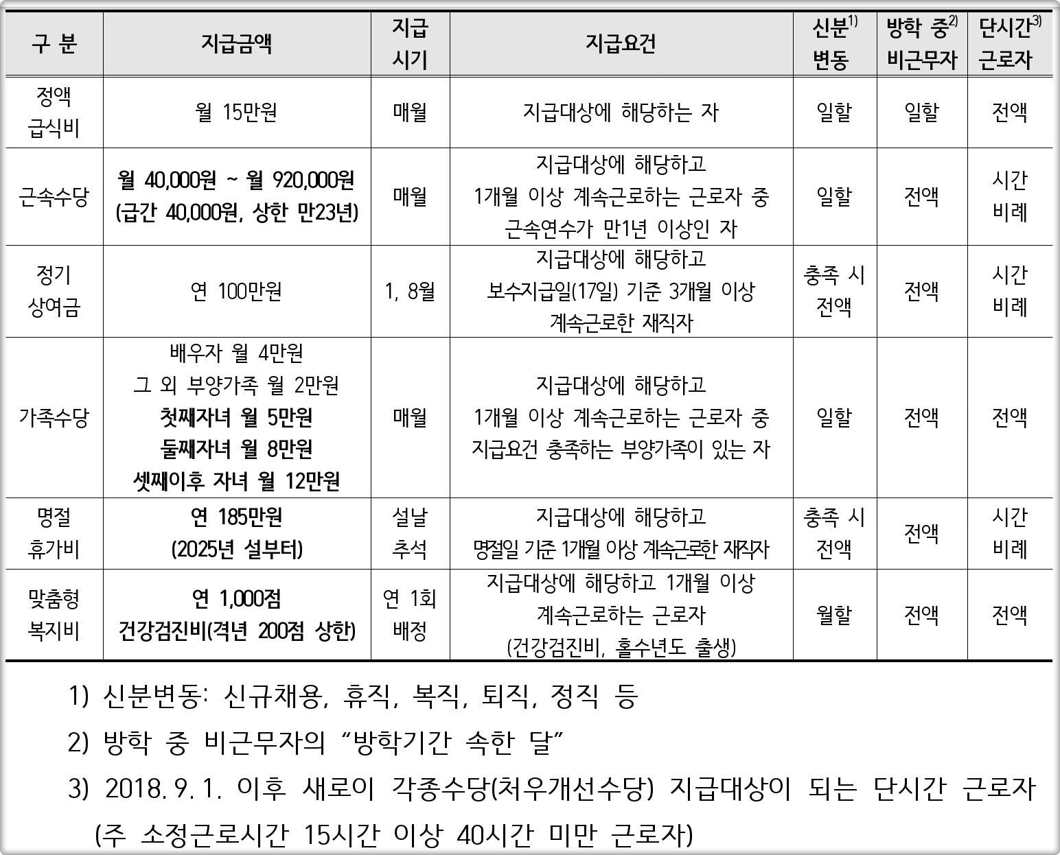 가족수당, 맞춤형복지비, 정액급식비는 전액 지급되는 반면에 근속수당, 정기상여금, 명절휴가비는 근로시간에 비례해서 지급됩니다.