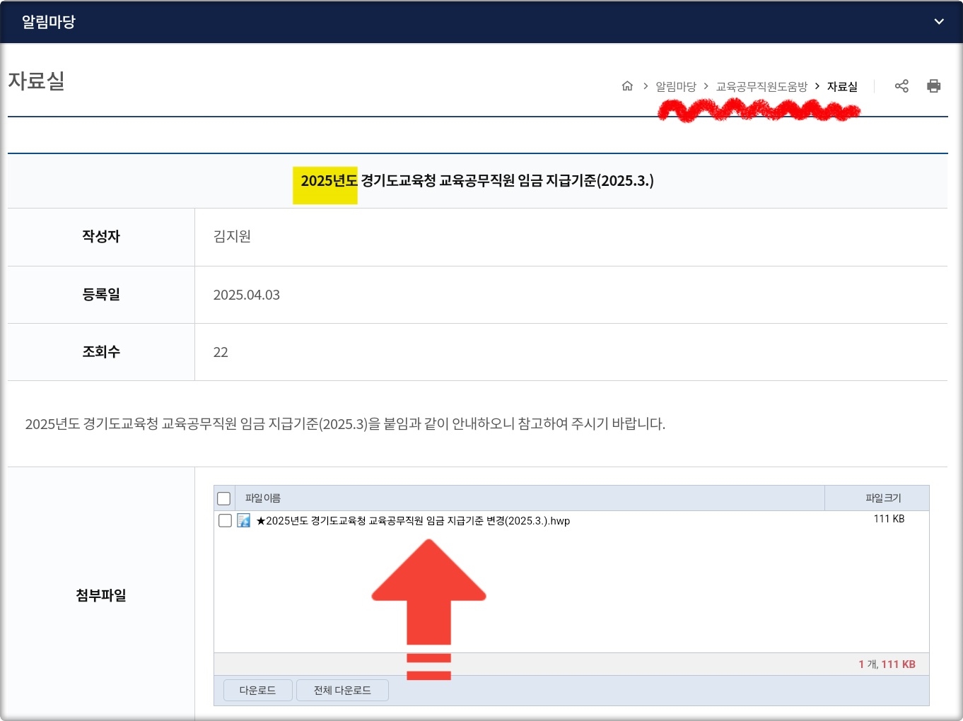 최신버전의 "2025 임금 지급기준" 파일은 성남교육지원청 홈페이지에서 확인할 수 있었는데요.