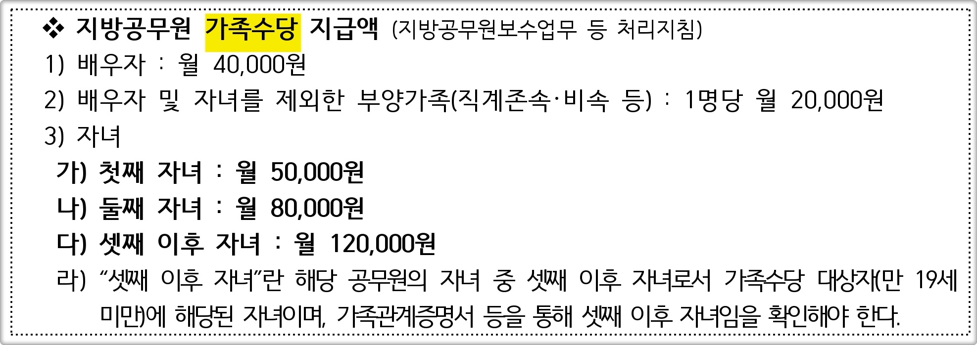 다만, 배우자가 이미 공무원이나 교직원으로 가족수당을 받고 있는 경우엔 중복으로 받을 수 없어요.