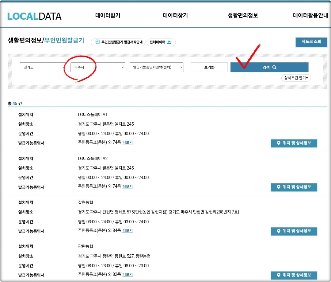 예를 들어 파주의 경우, 주민등록등본 발급이 가능한 무인민원발급기가 45군데 있어요.
