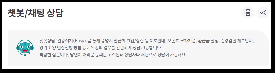 챗봇상담 ‘건강이지(Easy)’를 통해 증명서 발급과 가입/상실 등 제도안내, 보험료 부과기준, 환급금 신청, 건강검진 제도안내, 장기 요양 인정신청 방법 등 276종의 업무를 간편하게 상담 가능합니다. 또 복잡한 질문이나, 답변이 어려운 문의는 고객센터 상담사와 채팅으로 상담이 가능한데요. 채팅상담은 본인 인증 후 상담사와 연결되며, 피부양자, 분할납부 등 상세 상담이 필요한 업무는 지사 및 고객센터 (1577-1000) 전화 상담이 필요할 수 있습니다.