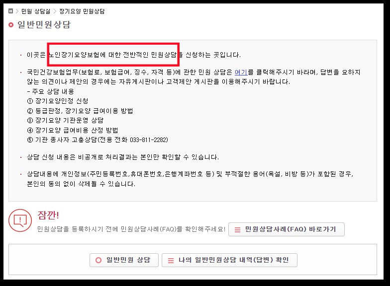 노인장기요양보험에 대한 전반적인 민원상담을 신청하는 곳입니다.