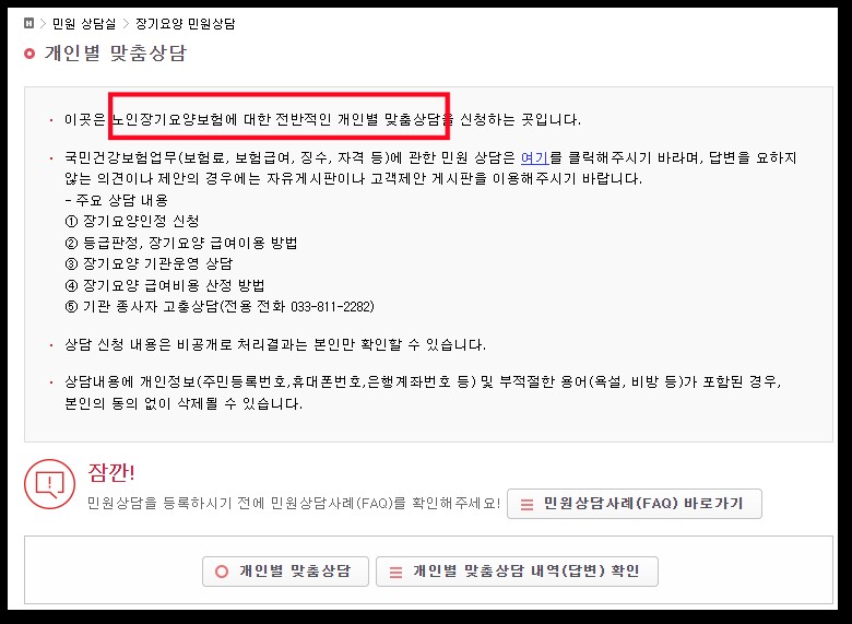 노인장기요양보험에 대한 전반적인 개인별 맞춤상담을 신청하는 곳입니다.