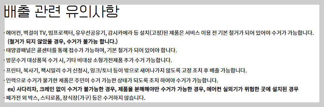 - 무거운 제품이라도 사람 인력으로 수거 가능한 상태여야 처리가 가능합니다.