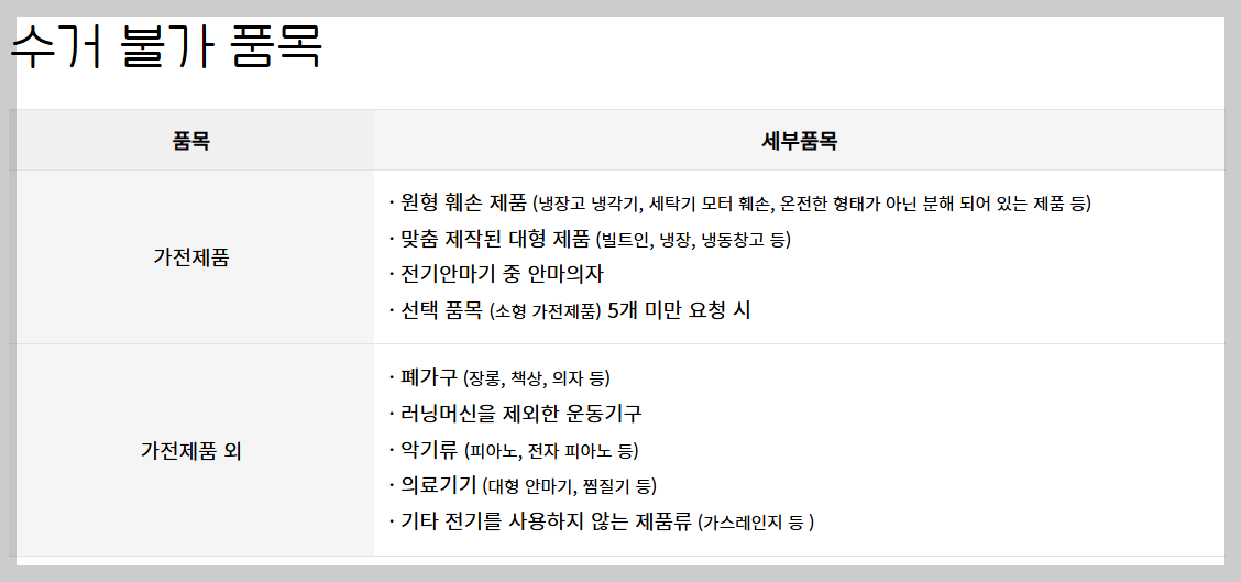 다음 품목은 부산대형가전 무료수거 서비스 대상이 아닙니다: