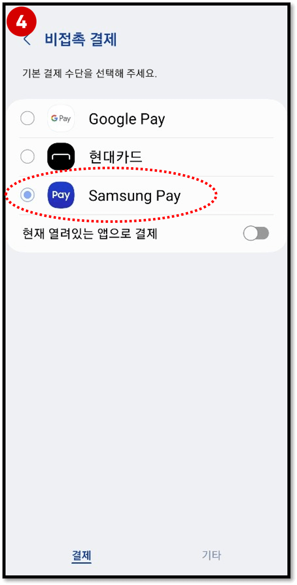 4) 마지막으로 [NFC 및 비접촉 결제] - [비접촉결제] - 기본 결제 수단을 "Samsung Pay"로 선택하시기 바랍니다.