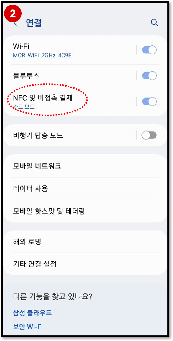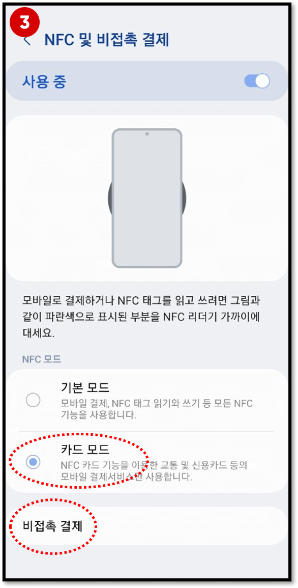 3) [NFC 및 비접촉 결제]에서 [카드모드]로 활성화시킵니다.