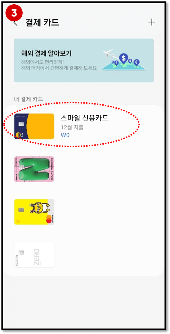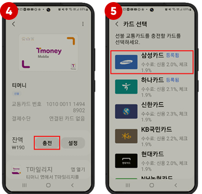 5) 선불교통카드를 충전할 결제카드를 선택합니다.