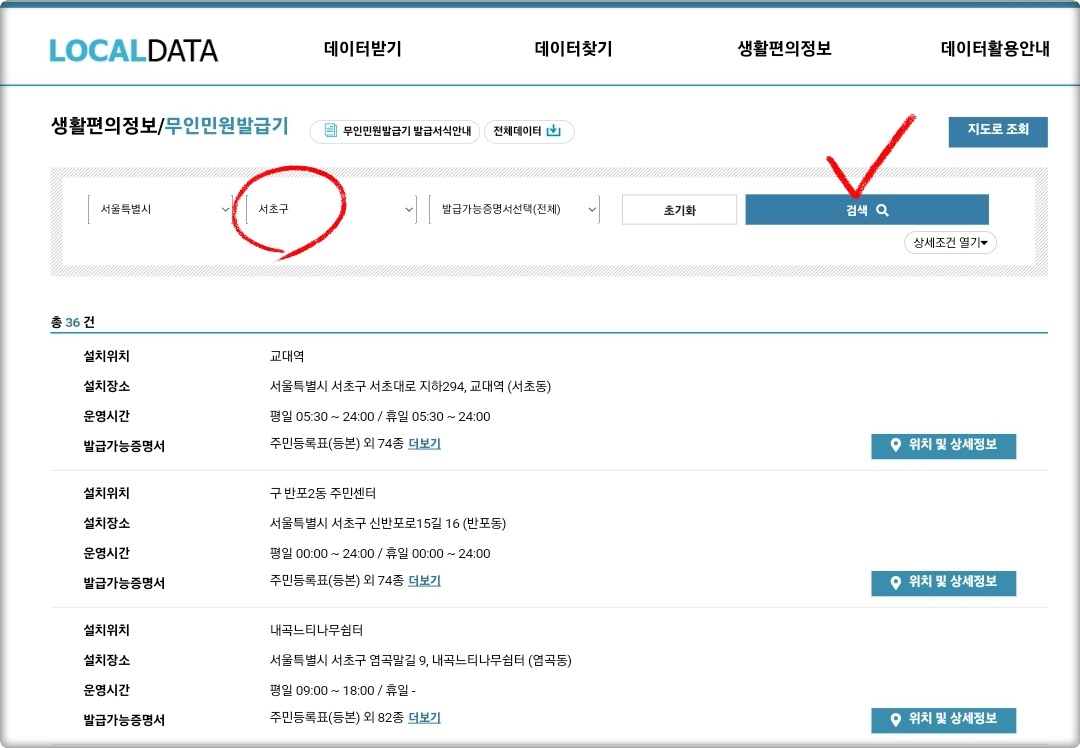 "서초구" 무인발급기 위치는 행정안전부에서 운영하는 '로컬데이터 포털'이 가장 잘 되어 있는 편인데요.