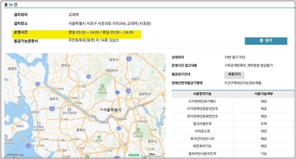 특히 서울 서초구를 기준으로 무인민원발급기를 조회해보니, 설치 장소에 따라 운영시간이 제각각 다르다는 것을 확인할 수 있었는데요.