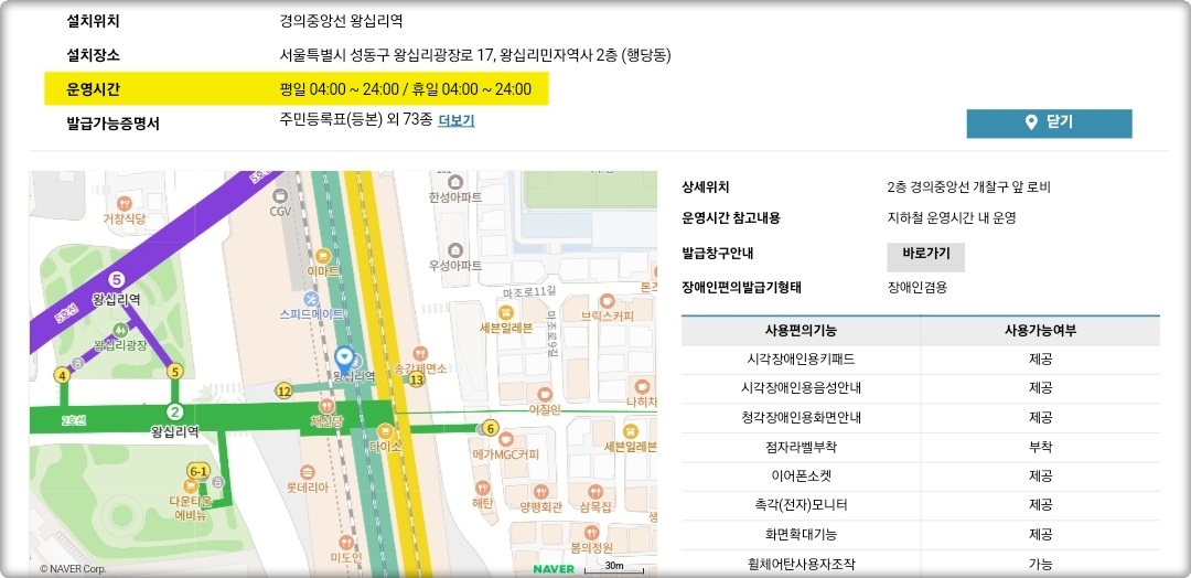 특히 서울 성동구를 기준으로 무인민원발급기를 조회해보니, 설치 장소에 따라 운영시간이 제각각 다르다는 것을 확인할 수 있었는데요.