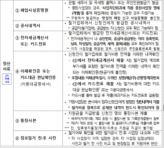 : 철거를 마친 뒤, 철거업체로부터 받은 공사내역서·세금계산서·이체확인증·철거 전후 사진 등을 제출합니다.