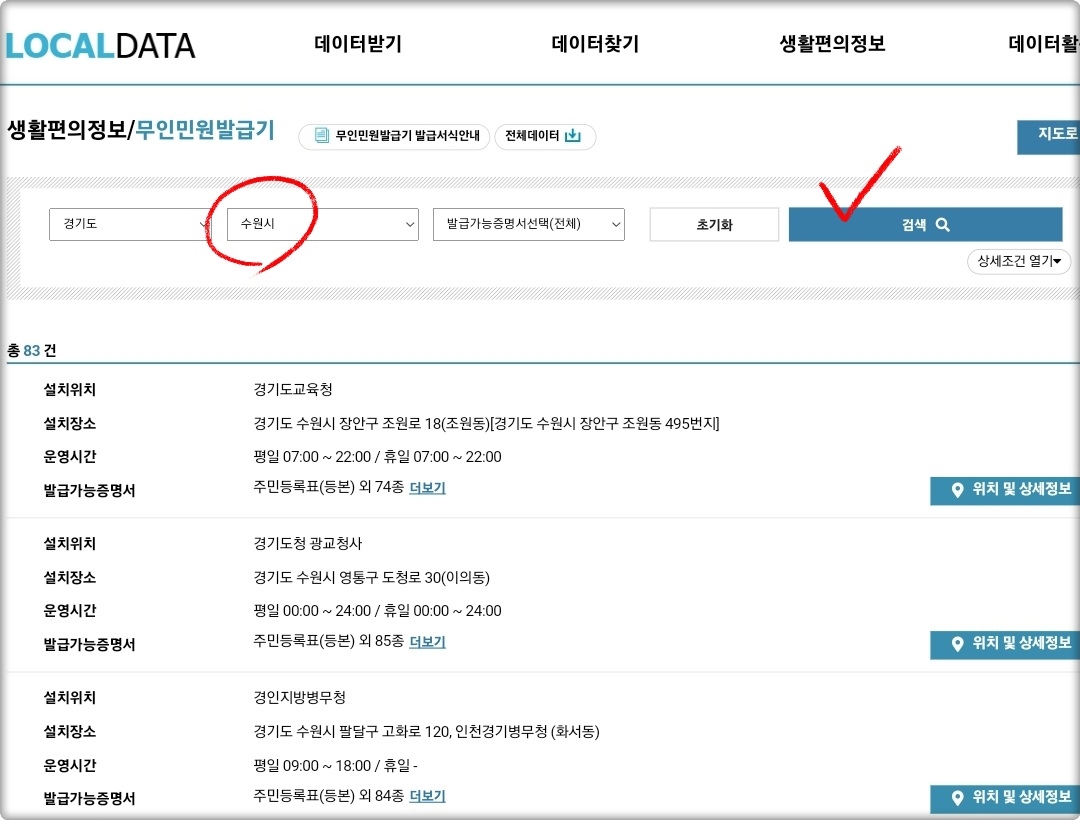 "수원시" 무인발급기 위치는 행정안전부에서 운영하는 '로컬데이터 포털'이 가장 잘 되어 있는 편인데요.