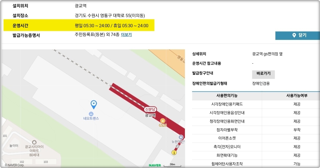 특히 경기 수원시를 기준으로 무인민원발급기를 조회해보니, 설치 장소에 따라 운영시간이 제각각 다르다는 것을 확인할 수 있었는데요.