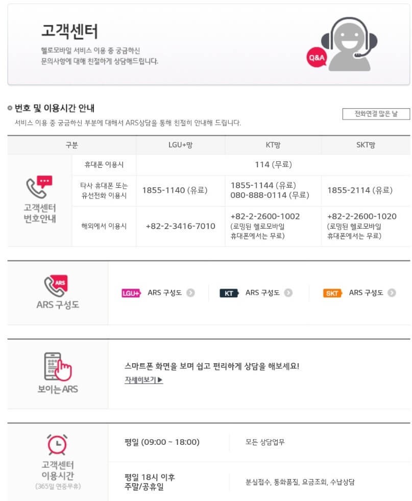 만약에서 타사 휴대폰이나 사무실 전화같은 유선 전화를 사용한다면 LGU+망은 1588-1140(유료), KT망은 1855-1144(유료) / 080-888-0114(무료)로 전화를 걸면 고객센터와 연결되며 마지막으로 SKT망은 1855-2114(유료)로 전화걸면 헬로모바일 고객센터로 연결 가능합니다.