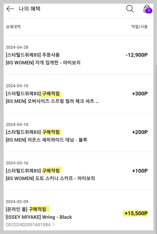 즉, 제가 쌓아놓은 멤버십 포인트는 SSF 쇼핑몰의 입점되어있는 다른 브랜드인 BAO BAO ISSEY MIYAKE에서 구입했던 링백이었는데요. 바오바오 가방 구매하면서 적립이 된 15,500 포인트가 있었는데 이걸로 에잇세컨즈 매장에서 사용할 수 있었습니다.