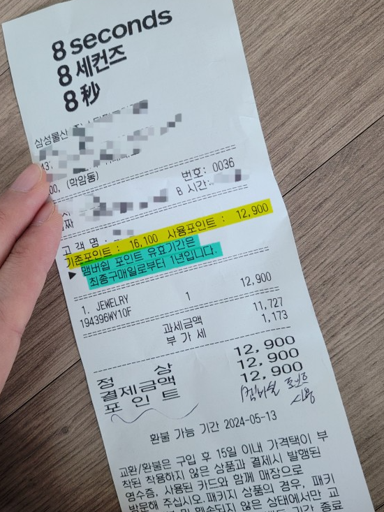 제가 에잇세컨즈 매장에서 집게 핀을 구매하고 받아온 영수증을 보니까 멤버십 포인트가 유효기간이 있더라고요. 유효기간은 최종 구매일로부터 1년이었습니다. 즉, 유효기간이 지나기 전에 사용 가능한 멤버쉽 포인트가 있는지 미리 확인해보시고 기간 내에 오프라인이든 온라인이든 무조건 쓰는 것이 좋습니다.