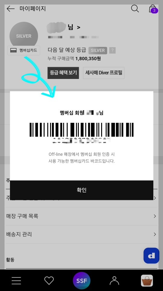 4️⃣ "오프라인 매장에서 멤버십 회원 인증시 사용 가능한 멤버쉽 카드 바코드"가 조회됩니다