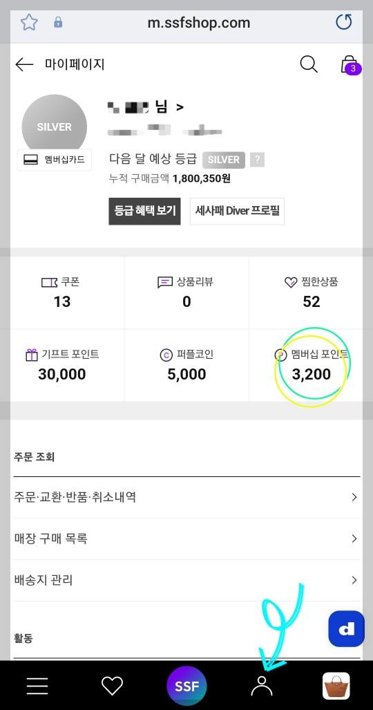 2️⃣ 메인 화면에 가장 하단에 있는 사람 모양 버튼을 눌러 '마이페이지'로 이동을 해서 내가 현재 보유하고 있는 멤버십 포인트를 확인합니다.