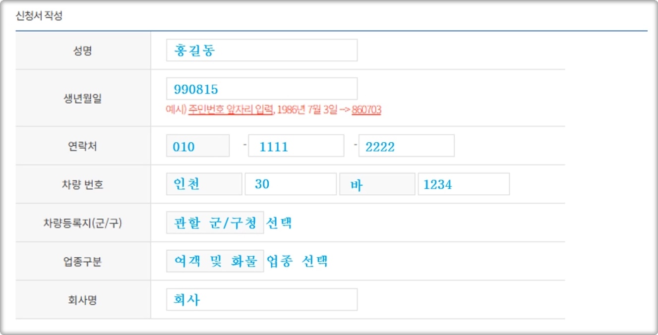 5️⃣ 신청서 작성 (생년월일 6자리, 연락처, 차량 번호, 차량 등록지(관할 군청·구청), 업종(여객·화물 선택), 회사명 입력)