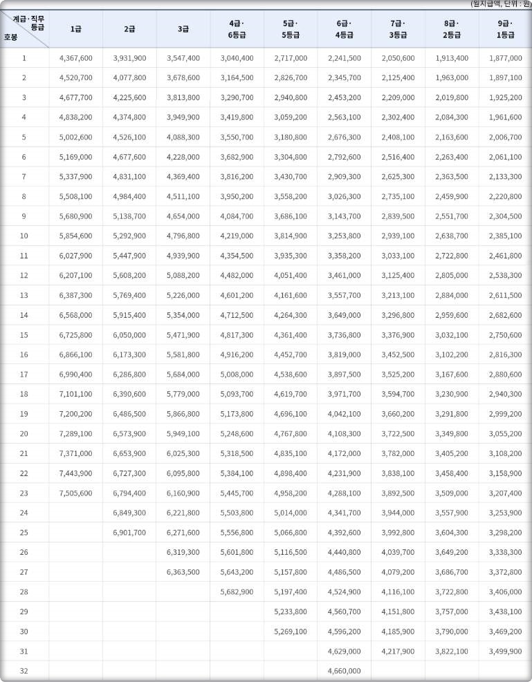 = 일반직공무원과 일반직에 준하는 특정직 및 별정직 공무원 등 봉급표