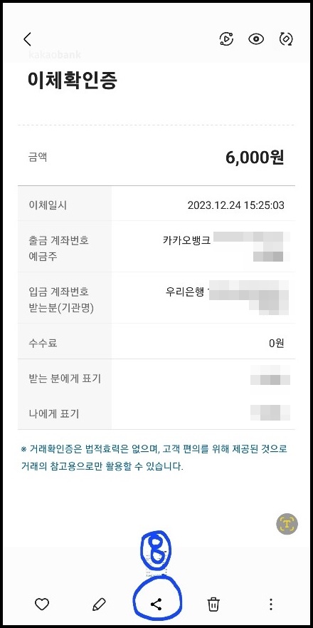 위 방법으로 공유하여 인쇄할 경우, 카카오뱅크 빨간 직인은 찍히지 않으며 거래확인증 용도라서 법적효력은 없습니다.