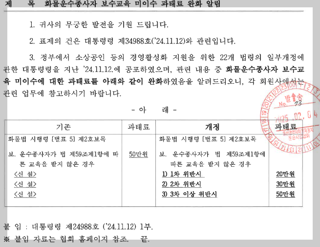 2025년부터는 일부 법령이 바뀌면서 화물보수교육 과태료 기준이 완화되긴 했지만,