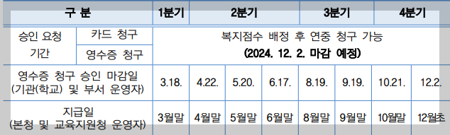 : 영수증 청구 후에 기관(학교) 및 부서 운영자의 승인(매분기 승인 마감일 전까지)이 있어야 분기별로 청구 금액이 지급됨