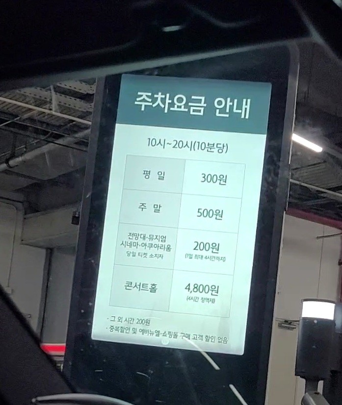 잠실 롯데월드몰 주차요금은 평일과 주말이 각각 차이가 있었는데요. 평일 같은 경우는 10분당 300원이며 주말은 10분당 500원이었습니다. 그리고 전망대, 뮤지엄, 시네마, 아쿠아리움 티켓을 소지하고 있다면 당일 티켓에 한해서 10분당 200원의 주차요금이 적용이 되는데요. 이 요금은 1일 최대 4시간까지만 적용이 됩니다. 그리고 콘서트홀을 이용하는 고객은 4시간 정액제로 4800원이었습니다.