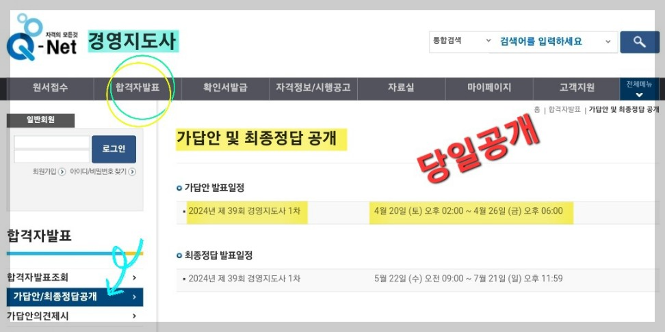 오늘 치러진 경영지도사 및 기술지도사 가답안을 볼 수 있는 곳입니다. 가답안은 전부 시험 당일에 공개가 되는데요. 이번 경영지도사 및 기술지도사 시험 같은 경우도 시험 당일인 2024년 4월 20일 토요일 14시에 공개가 될 예정입니다. 구체적인 가답안 확인 경로는 두시험이 각각 사이트가 다르니 원하는 시험을 위에서 선택하시면 가답안 확인 페이지로 바로 이동됩니다. 해당 경로 즐겨찾기 해두시고 오후 2시에 빠르게 확인해보시기 바랍니다.