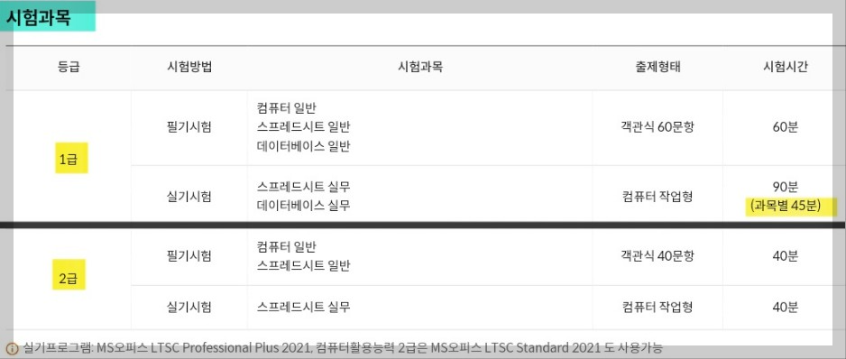 1급은 데이터베이스 부분과 스프레드시트 부분으로 나뉘어져 있습니다. 각각 70점 이상이 되어야 합격이 가능하며, 2급의 경우엔 70점 이상이면 합격입니다.