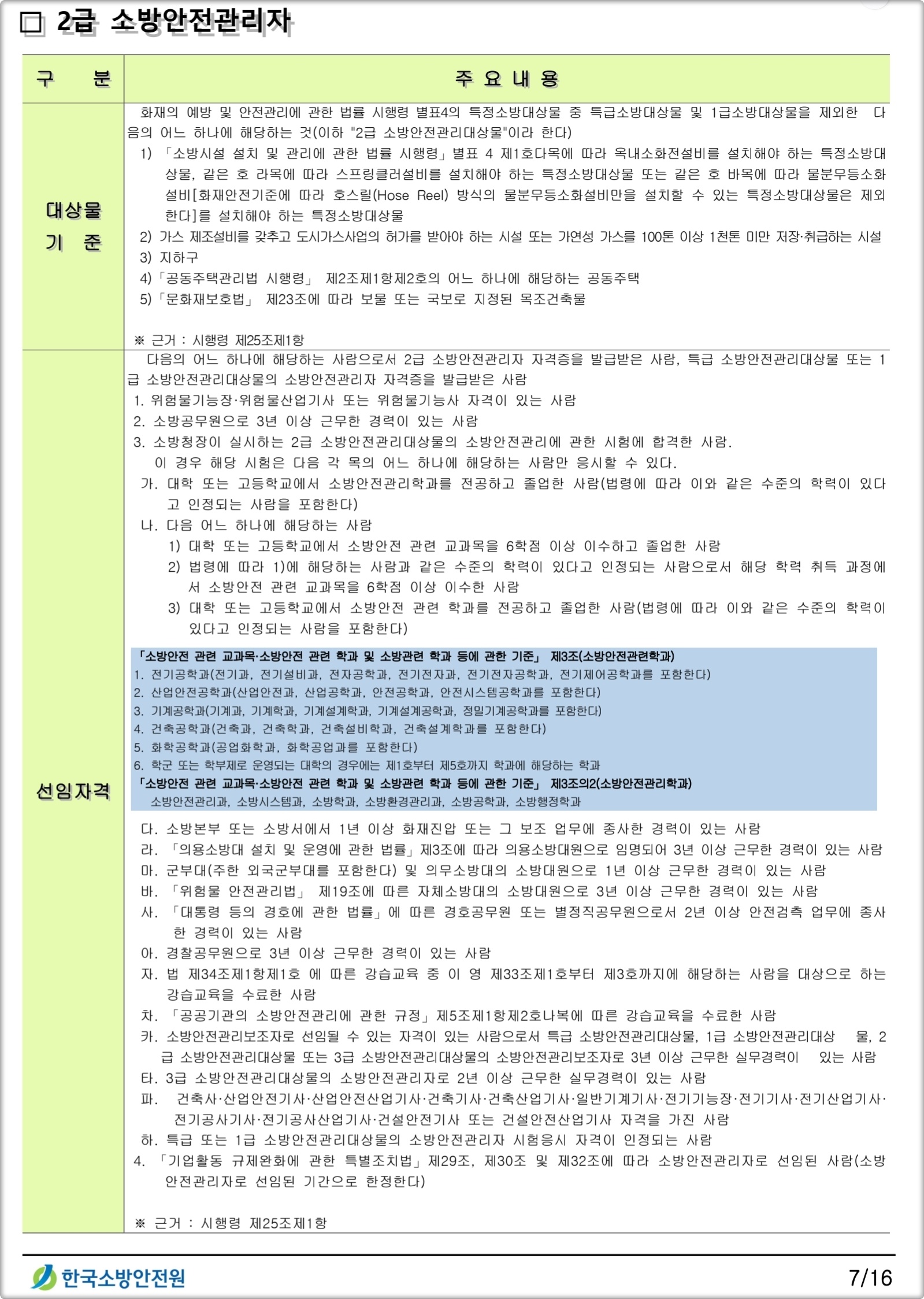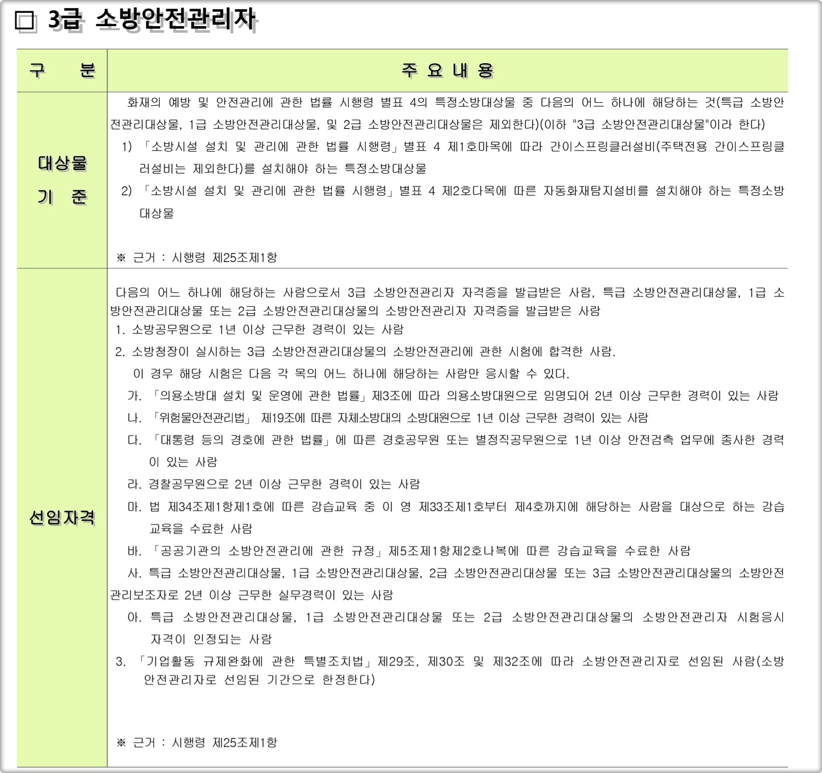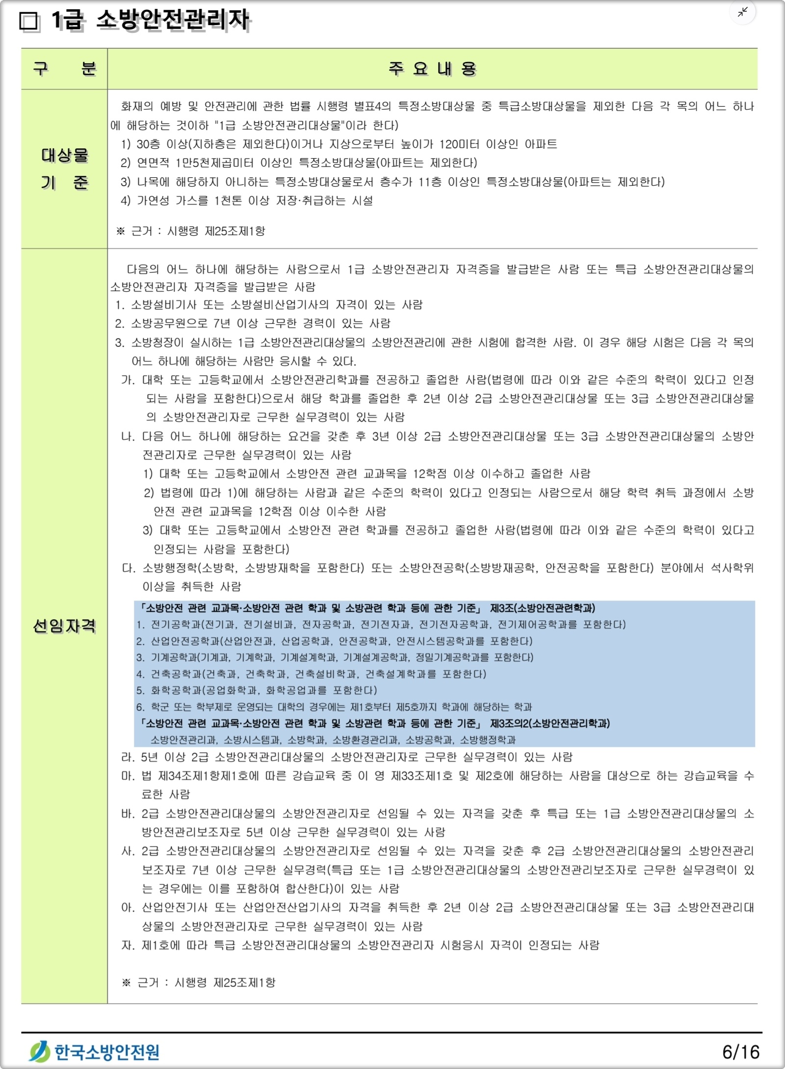 정확한 선임 자격을 확인하려면 법제처 자료보다는 '한국소방안전원'에서 제공하는 자료를 참고하는 게 좋은데요.